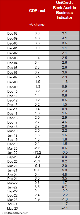Economic sentiment in Austria has worsened as spring progresses. "The UniCredit Bank Austria Business Indicator fell to minus 2.4 points in May. Falling for the third time in a row, the indicator has dropped to a level comparable to that of autumn last year", says UniCredit Bank Austria Chief Economist Stefan Bruckbauer, adding: "With this further deterioration, our economic indicator for the second quarter shows that economic development continues to be weak in Austria. The stagnation that has persisted since the second half of 2022 will therefore continue into the summer."