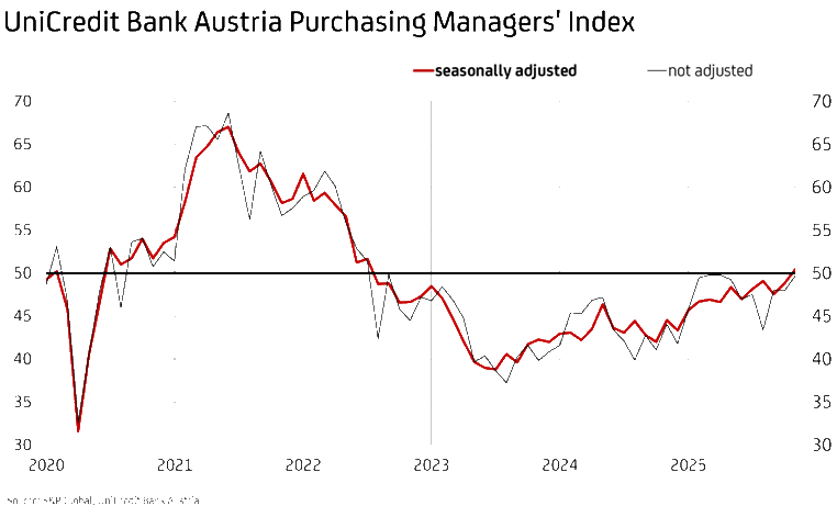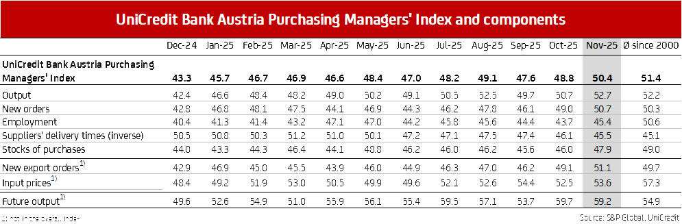 - The UniCredit Bank Austria Purchasing Managers' Index rose to 50.4 points in November, exceeding the neutral threshold for the first time since July 2022