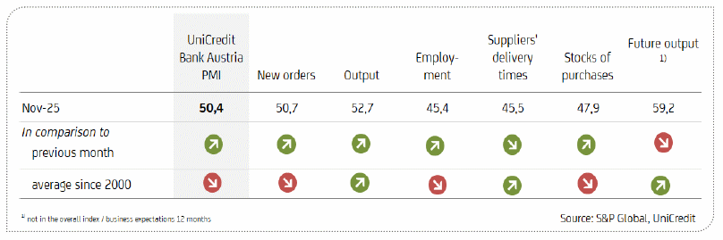 - The UniCredit Bank Austria Purchasing Managers' Index rose to 50.4 points in November, exceeding the neutral threshold for the first time since July 2022