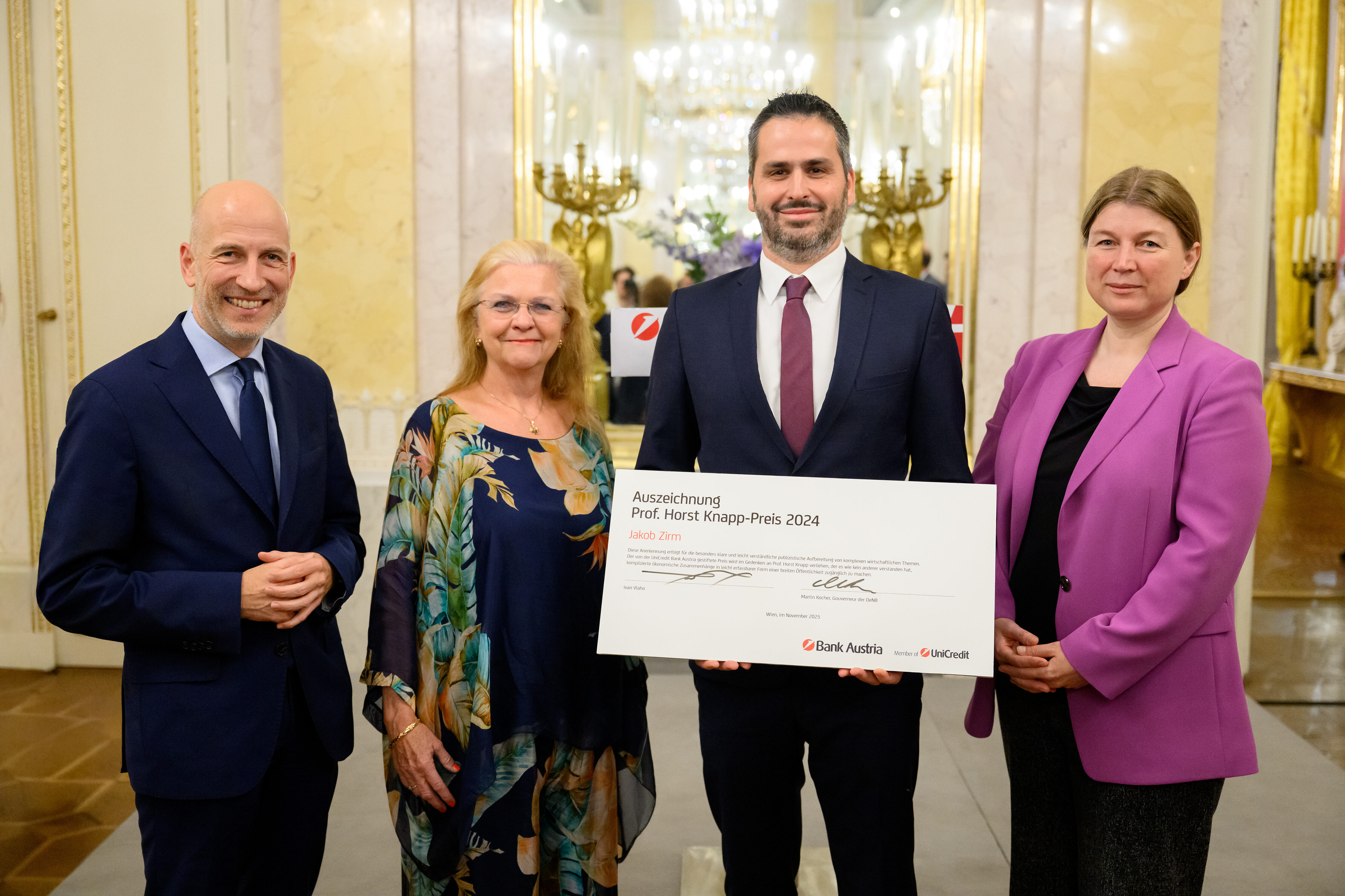 v.l.n.r.: Martin Kocher, Gouverneur der Oesterreichischen Nationalbank, Karina Bachlechner, Tochter von Prof. Horst Knapp, Jakob Zirm, Leiter des Wirtschaftsressorts der Tageszeitung „Die Presse“, Marion Morales Albiñana-Rosner, Vorständin für Private Banking & Wealth Management der UniCredit Bank Austria
