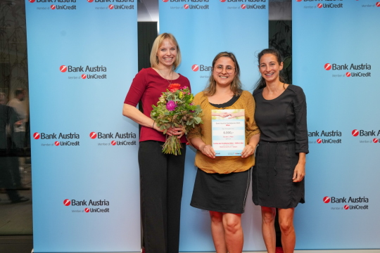 v.l.n.r.: Sigrid Stagl, Leiterin des Instituts für Ecological Economics am Department für Sozioökonomie der WU Wien; Gottfried Haber, Vize-Gouverneur der OeNB; die beiden Preisträger Uwe Sommersguter und Manfred Neuper, Kleine Zeitung; Karina Bachlechner, Tochter von Prof. Horst Knapp; und Marion Morales Albiñana-Rosner, Vorständin Wealth Management & Private Banking der UniCredit Bank Austria