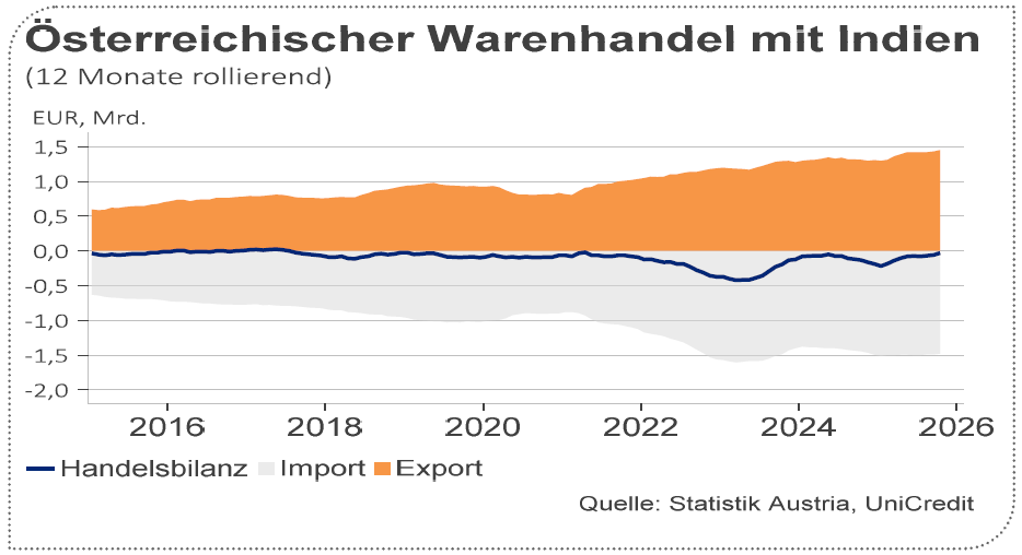 - Österreich exportierte 2024 Waren im Wert von 1,3 Mrd. Euro nach Indien, das Importvolumen lag bei 1,5 Mrd. Euro